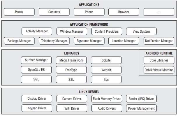 In order to understand how Android works, take a look at Figure 1-1, which shows the various layers that make up the Android operating system (OS). The Android OS is roughly divided into five sections in four main layers: