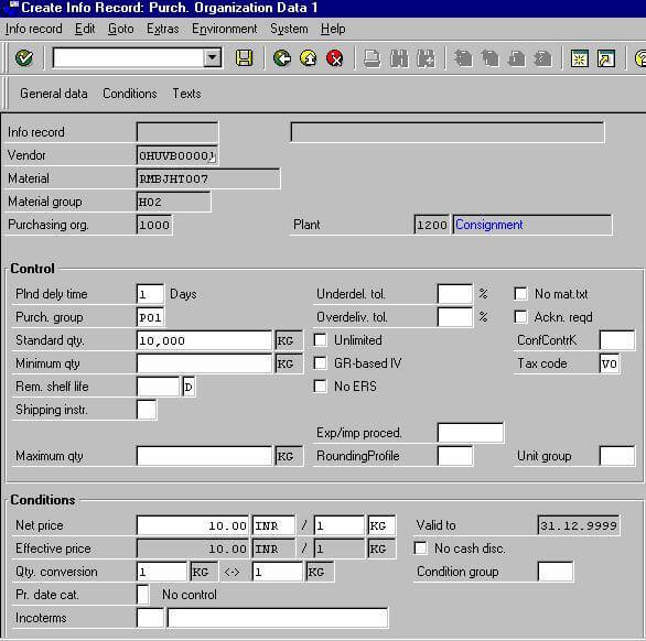 - Info Record – Info record number : This number will be provided when the Info record is saved.