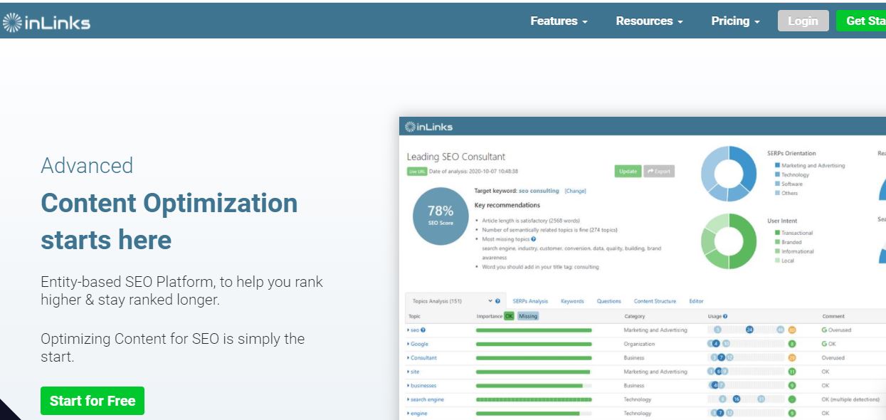 InLinks platform will combine several different research functions and optimize your content recommendations based on keyword research, semantically relevant topics from their knowledge graph. If you want your content to rank higher than your competitors, then simply paraphrasing existing articles is useless. To rank higher you’ll have to optimize content that hasn’t been written yet. InLinks will go deeper and analyze your competitors’ content to find relevant ideas.