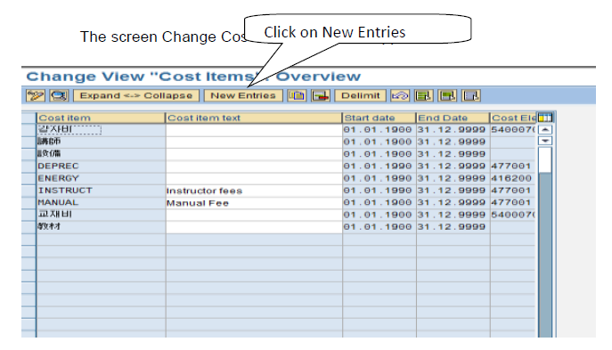Check to see whether the table contains cost items that meet your requirements. If not, create new cost items. Click on New entries.
