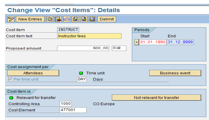 Training and Event Management uses cost items to determine and represent the costs of a business event. You require cost items if you want to use the functions cost transfer posting, internal activity allocation for instructors, and price proposal determination.