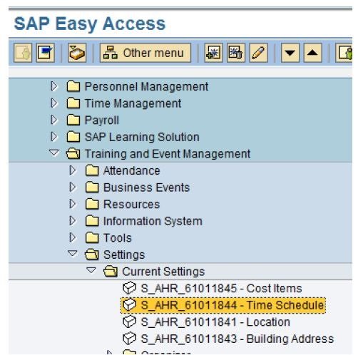Human Resources -> Training and Events-> Business Events -> Settings -> Current Settings -> Time Schedule.