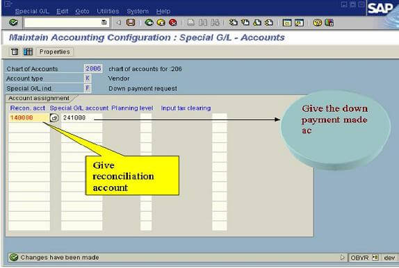 SAP Down payment are treated as special general ledger transactions in sap. The down payment transactions will be stored in the vendor account with special general ledger indicator. The corresponding entry will be posted in alternative reconciliation account number.